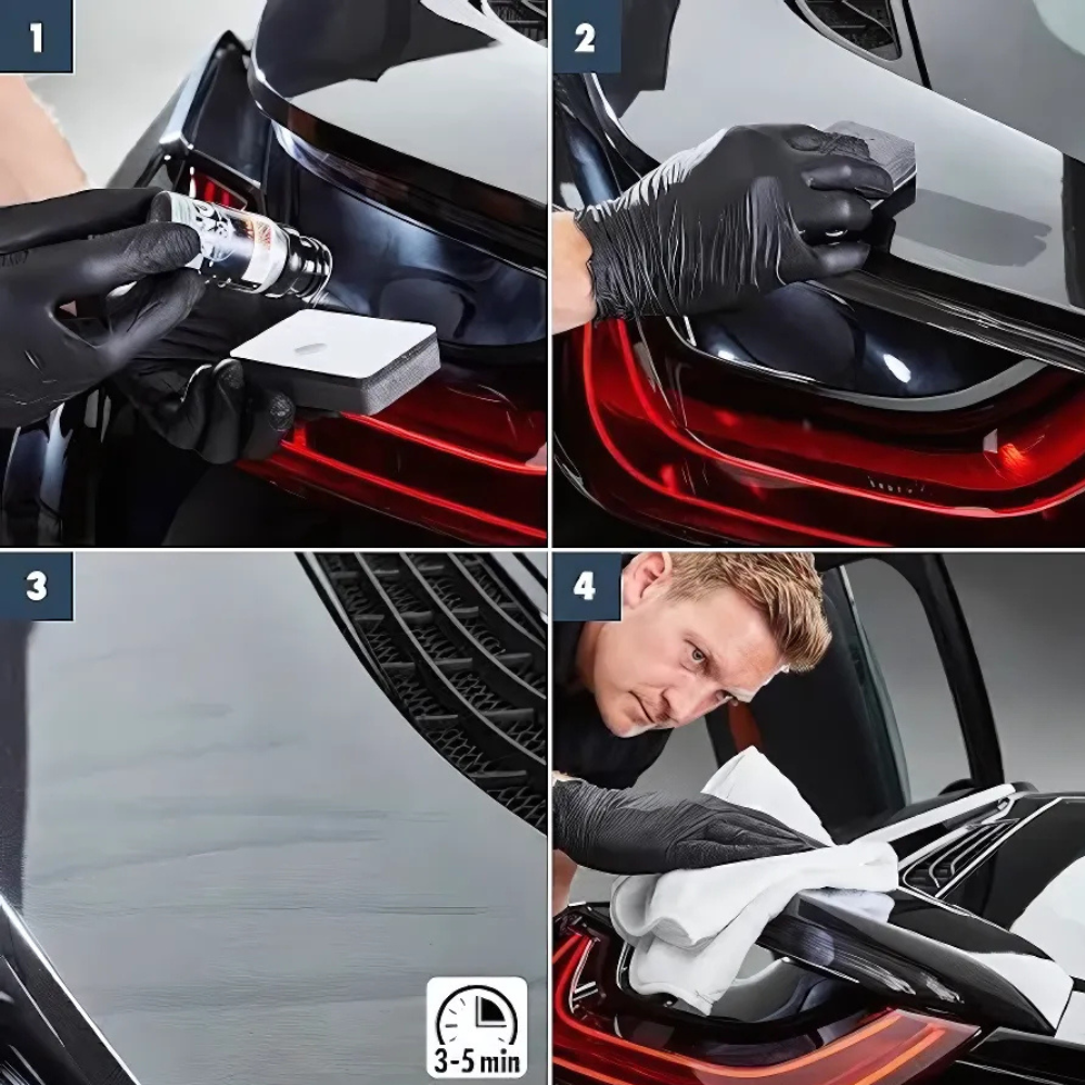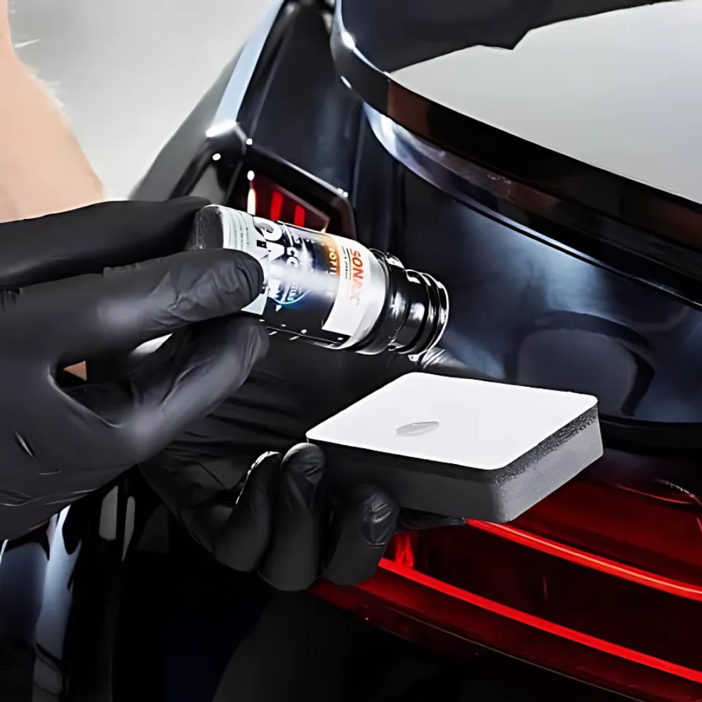 Antes de aplicar, asegúrate de que la superficie esté completamente limpia y libre de rayones. Luego, aplica con las esponjas incluidas, deja actuar y retira con un paño limpio.